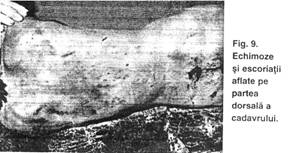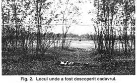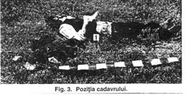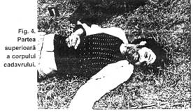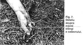In mana stanga a cadavrului s-au gasit fire de iarba stranse in palma, precum si in cavitatea bucala. Aspectele de la fata locului au fost inregistrate pe pelicula foto de catre ofiterul criminalist Costel Munteanu ( Fig. 1, 2, 3, 4, 5, 6, 7 ).