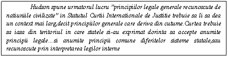"Curtea a carei competenta este sa solutioneze disputele in conformitate cu dreptul international, trebuie sa supuna prevederilor sale: (a) conventiile internationale, (generale sau particulare), creand legi expres recunoscute de statele aflate in disputa; (b) cutuma internationale, (ca dovada a practicii generale acceptate ca lege); (c) principiile generale ale dreptului, (recunoscute de natiunile civilizate); (d) subiectul prevederilor art. 59, deciziile judiciare si teoriile doctrinarilor in domeniu cu intelesuri secundare pentru determinarea regulilor de drept"[16].