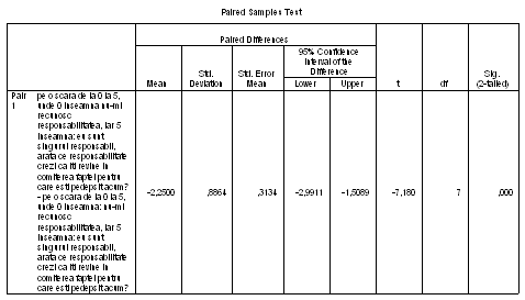 Evaluarea finala a interventiei s-a realizat prin designul experimental cu esantioane perechi de tip pretest - posttest.Astfel, un grup de 8 subiecti au participat la un program de grup de dezvoltare morala in vederea intelegerii consecintelor infractiunilor de catre minorii condamnati penal si intelegerii si asumarii responsabilitatii ce le revine in comiterea infractiunilor.Gradul responsabilitatii asumate a fost masurat inainte si dupa programul de grup utilizand acelasi instrument-chestionarul. In urma interventiei la grupul experimental s-a obtinut o diferenta a mediilor de -2,2500 asociata unui t= -7,180 (m1=2,9911; m2= 1,5089), df= 7. Diferenta nu a atins pragul semnificatiei statistice, p = 0,000< 0,05 ceea ce poate inseamna ca interventia a avut efect, desi timpul scurt alocat acesteia face imposibila evidentierea unor rezultate notabile, importante in sensul dezirabilitatii sociale.