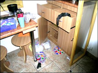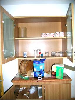 Foto nr. 2-3 Aspecte din bucataria locuintei. Placutele cu nr. 5 si 6 indica locurile de unde se reclama lipsa unor bijuterii din aur. Sageata indica locul de unde s-a ridicat o urma papilara.