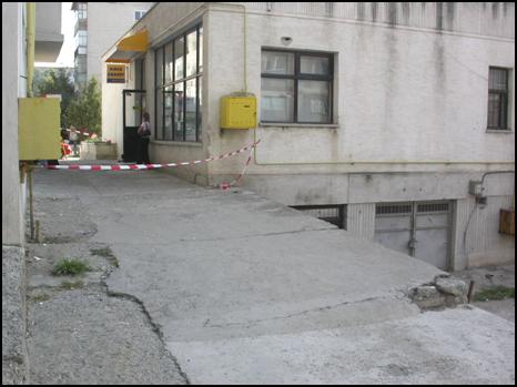 Foto nr. 2 Locul unde este situata casa de amanet "RAM TRAD", pe str. Primaverii, din Municipiul Botosani, respectiv gangul dintre blocurile 23 si 24. Sageata indica usa de acces a acesteia.