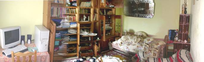 Foto nr. 2 Aspecte din sufragerie, mobilierul de pe latura vestica si respectiv cea nordica. Sageata nr. 1 indica locul de unde s-au ridicat doua fragmente de urme papilare iar sageata nr. 2 indica locul de unde se reclama lipsa sumei de 750 Euro.