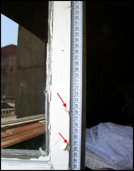 Foto nr. 5-6 Fereastra de la balconul locuintei. Sageti indica urmele de apasare existente la nivelul sistemului de inchidere si detaliul acestora.