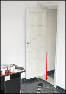 Foto nr. 5-6 Usa ce face accesul din primul birou in hol, precum si urmele de fortare existente pe pragul acesteia (indicate cu sageata si ilustrate in foto nr.6).