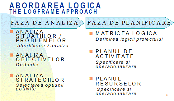 Abordarea in Cadrul Logic (Logical Framework Approach - LFA) este un set de instrumente pentru designul si managemenul proiectelor. Aceasta abordare implica un proces iterativ de analiza si un format de prezentare a rezultatelor acestui proces. Stabileste intr-un mod sistematic si logic obiectivele programului ale proiectului, precum si relatia cauzala dintre ele, cu scopul de a indica modul in care trebuie sa verificam daca au fost indeplinite aceste obiective si sa stabilim ce factori din afara proiectului sau programului pot influenta succesul acestuia.