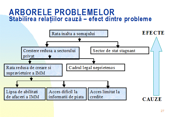 Un instrument util in analiza problemelor si stabilirea problemei reale asupra careia proiectul va interveni il reprezinta arborele problemelor. Acesta consta in ierarhizarea diverselor aspecte legate de problemele dintr-un anumit domeniu si stabilirea unei relatii CAUZA - EFECT intre diverse probleme. Arborele problemelor este o diagrama care reprezinta grafic aceasta relatie cauza - efect.