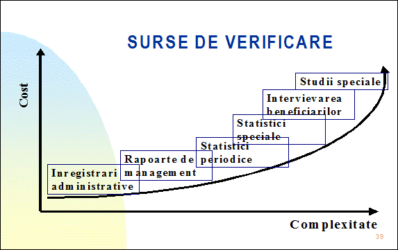 Tabelul de mai jos exemplifica ceea ce ar trebui sa reflecte indicatorii, precum si surse posibile de date si mijloacele de verificare pentru pe niveluri ierarhice: