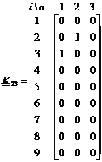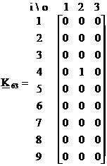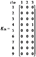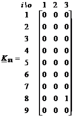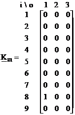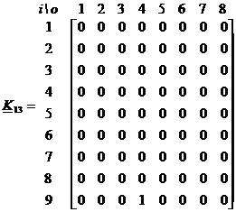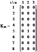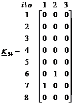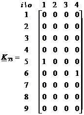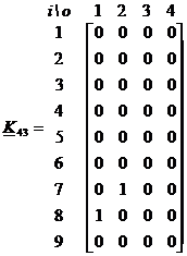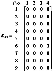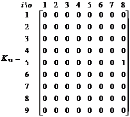 Constructia matricelor de cuplare se realizeaza conform formulelor 2.2. - 2.7. si se exemplifica doar constructia matricei K84. Numarul de coloane ale matricei va fi egal cu numarul de output-uri din subsistemul opt (in cazul de fata apar doua coloane), iar numarul de linii ale matricei va fi egal cu numarul de input-uri din subsistemul patru (opt linii). Dupa cum se observa din figura 9.2. exista doar un singur flux (de informatie) de la subsistemul opt la subsistemul patru, pentru care corespunde: