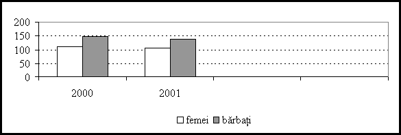 Se observa o pondere usor superioara a personalului masculina atat in 2000 - 56,92% cat si in 2001 - 56,79%.
