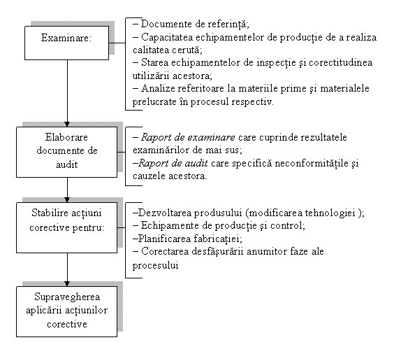 Din analiza factorilor de productie rezulta cauzele care au determinat realizarea produsului la un nivel inferior conditiilor specificate. Managementul firmei auditate are obligativitatea de a initia actiuni corective care sa inlature cauzele generatoare de neconformitati. Astfel de actiuni constau in: modificarea procesului tehnologic de realizare al produsului; modernizarea unor utilaje de productie; instruirea personalului de executie si control; schimbari organizatorice; imbunatatirea planurilor de receptie calitativa; schimbarea furnizorilor, etc.