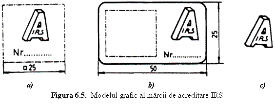 Organismele acreditate de Institutul Roman de Standardizare primeau dreptul de a utiliza Marca de acreditare - IRS pentru certificatele pe care le emit si pentru reclame. De asemenea, se putea aplica pe produsele certificate, pe scrisorile si documentele de lucru, pe sediile proprii. Marca de acreditare trebuia sa respecte proportiile modelului grafic din figura 6.5.a iar cand se aplica pe documente sa respecte dimensiunile din figura 6.5.b. Marca se poate aplica pe documente impreuna cu marca de certificare, caz in care trebuie sa respecte dimensiunile din figura 6.5.c.