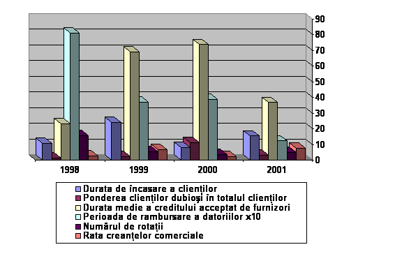 Rata creantelor comerciale inregistreaza in 1998 valoarea de 2,89, crescand apoi in 1999 la 6,62; scade in 2000 la 2,23 si creste in semestrul I 2001 la 7,45. Aceste valori ale ratei comerciale sunt in general valori favorabile, avand in vedere faptul ca unitatea comercializeaza produsele sale preponderent la export, pe baza de contracte si comenzi ferme iar incasarea are loc in termenul legal.