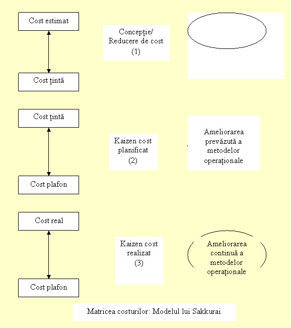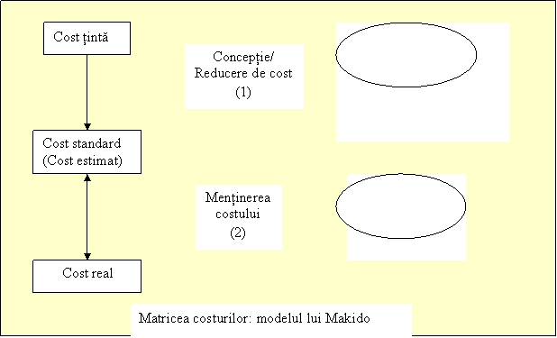 EII. O a doua etapa este luata in considerare in faza de productie propriu-zisa si consta in a controla costurile reale pentru a le mentine aproape de costurile tinta: se vorbeste deci de "mentinerea de cost" (2). Ajustarea este ilustrata prin schema cunoscuta sub numele de modelul lui T. Makido.