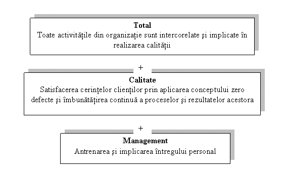Managementul calitatii totale reprezinta un mod de a organiza si implica intreaga organizatie, fiecare departament, fiecare activitate, fiecare persoana si fiecare nivel, in realizarea cerintelor de calitate atat cele externe, implicite si explicite dar si cele interne legate de satisfacerea angajatilor si obtinerea rentabilitatii pe termen lung a firmei.