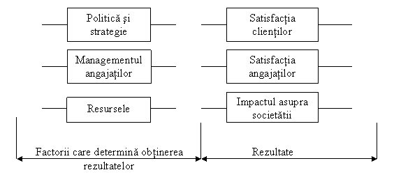 Modelul prezentat in figura 8 ilustreaza ca procesele si angajatii dintr-o organizatie reprezinta factorii principali care fac posibila obtinerea rezultatelor. Acestea se concretizeaza in: satisfactia clientilor externi, satisfactia angajatilor (clienti interni), influenta asupra societatii (impact ecologic, progres tehnic). In ceea ce privesc rezultatele afacerii acestea pot fi evaluate atat pe baza unor indicatori financiari (profit, valoare adaugata, lichiditati, etc.) cat si a unor indicatori nefinanciari ( nivelul calitatii produselor, deficiente pe unitatea de produs , numar de reclamatii, fiabilitatea in exploatare, etc.)