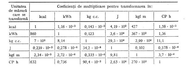 In cazul bilanturilor energetice complexe, este necesara exprimarea tuturor formelor sau purtatorilor de energie intr-o singura unitate de masura si anume in aceea specifica formei de energie cu ponderea cea mai mare in sistemul analizat. In tabela 3.1 se prezinta coeficientii de transformare a unitatilor de masura a energiei.
