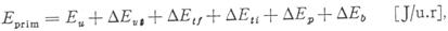 in care Eprim reprezinta energia primara; Eu - energia utila; DEut - energia pierduta ia nivelul instalatiilor de utilizare; DEtf - pierderile de energie la nivelul instalatiilor de producere, transport si distributie; DEti - pierderile de energie la nivelul instalatiilor de pregatire a combustibilului (cocserii, .semicocserii, furnale instalatii pentru lichefiere, etc.); DEp - pierderile de energie la nivelul prepararii purtatorilor (prelucrare, brichetare, rafinare, preparare, etc.); DEb - pierderile de energie la nivelul sursei primare.