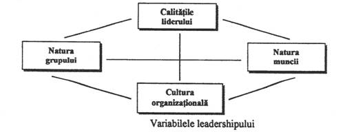 Dintre toate punctele de vedere expuse, rezulta o caracteristica comuna tuturor definitiilor: leadershipul este un proces complex care se defineste in termeni de grup, se refera la participarea obtinuta prin mijloace necoercitive (o participare liber consimtita) si are ca finalitate indeplinirea obiectivelor. In urma consultarii a numeroase referinte bibliografice rezulta ca cel putin asupra acestor elemente de caracterizare a leadershipului nu exista controverse. Trasatura de baza ramane aceea ca leadershipul este abilitatea de a inspira si stimula membrii grupului ca obtinerea succesului merita osteneala. Studiile realizate in ultimii 30 de ani conduc la concluzia ca exista patru variabile cruciale pentru analiza leadershipului: calitatile liderului, natura grupului, natura sarcinilor de munca si cultura organizationala, variabile prezentate in figura de mai jos