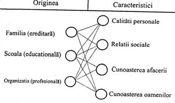 Caracteristicile leaderilor se pot ordona in cateva grupe esentiale: calitati personale; relatii sociale; cunoasterea profunda a oamenilor. Aceste caracteristici isi au originea in trei domenii de baza: familia, scoala si organizatia.