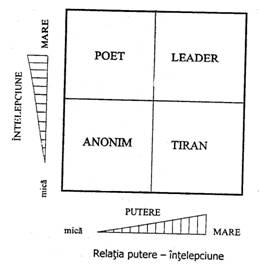 In trecut au convietuit trei moduri de conducere care exprimau valori ce trebuie admirate: curajul, onoarea si apararea natiunii au creat razboinicii, aventurierii si eroii; intelepciunea, care ii inspira pe ganditori, filosofi si mistici; ordinea, legea, care erau apanajul celor care administrau afacerile cetatii (regi, politicieni)[31]. Afirmarea democratiei si dezvoltarea gandirii individuale l-au propulsat ca lider pe cel care iese din comun. Ceilalti au dreptul sa-l judece, sa aprecieze daca actiunea sa este buna sau rea, justificata sau nu. Astazi liderul este acela care are influenta asupra celorlalti in asa masura incat sa le insufle dorinta de a-l urma. Pe aceasta linie de idei, pentru leaderi se impun o serie de calitati caracteristice: cunoasterea grupului si a sectorului de activitate (mediul intern si extern, tehnologii, personalitati cheie, stimulente care motiveaza fiecare individ); relatii in societate si in sectorul de activitate; reputatie si antecedente privind succesele anterioare; aptitudini si competente (capacitatea de analiza, rationamente sigure, gandire strategica si multidimensionala, facultatea de a crea relatii bune de munca, mobilitate fata de altii, intelegerea naturii umane); calitati personale (onestitate, integritate); o motivare puternica pentru a deveni lider. Unele dintre aceste calitati se pot forma, fiind educabile. Asupra interdependentei dintre putere si intelepciune, pe care am reprezentat-o schematic, nu mai insistam.