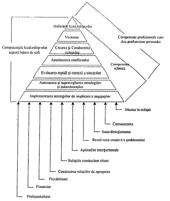 c) Competentele profesionale adauga profunzime piramidei. Cea mai mare parte a acestor competente provine din experiente si invatarea din aceste experiente. Daca o persoana poate avea puterea competentelor interioare si a celor de leadership, numai din intamplare si eroare, si mai tarziu prin reflectare poate obtine competentele profesionale pentru a deveni un bun leader. Fiecare organizatie reclama un set diferit de competente profesionale pentru fiecare pozitie de leadership.