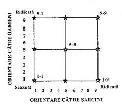 - liderul echipei (9-9) - conduce prin exemplu pozitiv; promoveaza un climat in care membrii echipei pot atinge potentialul maxim, atat in plan individuali, cat si ca membri ai echipei; incurajeaza simultan indeplinirea obiectivelor echipei si strangerea relatiilor intre membrii echipei; formeaza si conduc cele nai performante echipe.