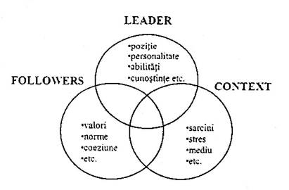 C. Modelul bazat pe interactiunea lider - followers - context / situatie. In figura de mai jos este prezentat modelul bazat pe interactiunea factorilor esentiali ai leadershipului.