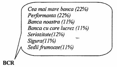 Imaginea BCR prin atribute specifice (figura 4.10) releva faptul ca in mod constant atributul care apare in asociere cu BCR este "inspira incredere', banca fiind recomandata prietenilor. O alta banca cu imagine distincta este CEC, considerata sigura (43%), care inspira incredere (28%), dar avand un personal rece, formal (8%). Raiffeisen si BRD sunt vazute ca banci care se adapteaza usor nevoilor clientilor (26%), BancPost este considerata o banca cu servicii variate (26%), cu un orar de lucru potrivit (24%), iar Banca Tiriac este perceputa ca avand clienti importanti (34%) si sigura (28%). Celelalte banci din sistemul bancar sunt mai putin cunoscute de catre intervievati.
