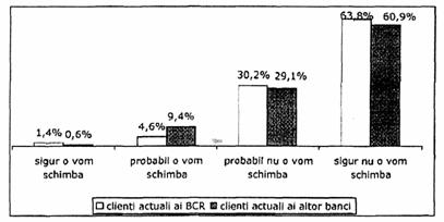 in general, clientii sunt fideli bancilor pe care le utilizeaza in prezent, mai mult de jumatate din ei declarand ca nu vor schimba banca cu care lucreaza. De asemenea, nici utilizarea unei alte banci decat cea folosita in prezent nu e vazuta ca probabila pentru viitor. Atunci cand utilizeaza mai mult decat o banca, clientii actuali ai BCR prefera utilizarea complementara a serviciilor BRD.