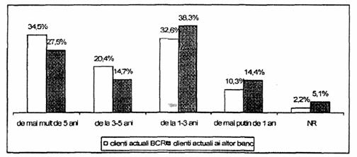Fidelitatea fata de bancile utilizate in prezent este deosebit de ridicata, indiferent de perioada pe care clientul a petrecut-o cu banca respectiva (Figura 7.15.). Clientii BCR au ramas fideli acestei banci in proportie de 55%, rest alegand sa utilizeze in prezent banci ca BRD (8% din cei care au fost vreodata clienti BCR), Banc Post (7%), Raiffeisen (7%) sau CEC (5%)