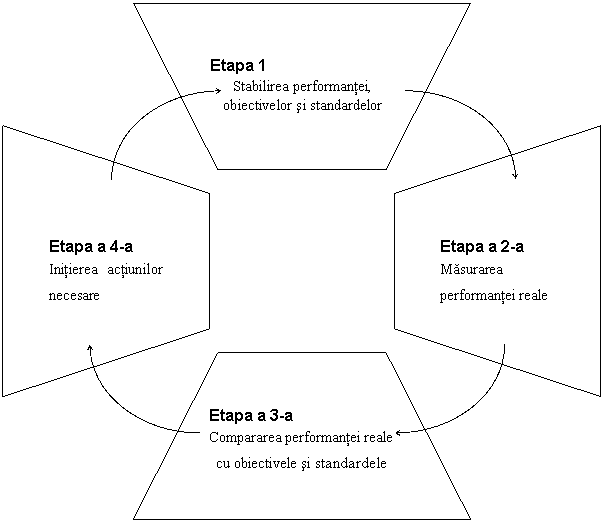 Etapa 1 - Stabilirea obiectivelor si standardelor. Procesul de control incepe cand obiectivele si standardele de performanta sunt stabilite prin planificare. El nu poate incepe fara aceste obiective. In aceasta etapa a procesului obiectivele performantei sunt definite si totodata si standardele de masurare a lor. Din perspectiva procesului general de control, doua sunt tipurile de standarde care pot fi definite.