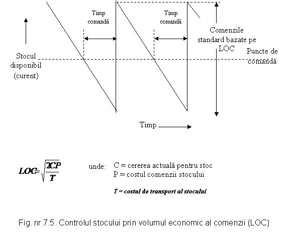 2. Cantitatea economica de comandat. (volumul optim de comanda sau lotul optim al comenzii LOC) reprezinta o metoda de control a stocului care implica comandarea unui numar fix de articole (bucati) de fiecare data cand nivelul stocului cade la un punct predeterminat. Cand acest punct este atins o decizie este automat luata (de cele mai multe ori printr-un computer) privind emiterea unei comenzi standard. Cel mai bun exemplu il constituie supermarket-ul unde sute de asemenea comenzi sunt stabilite pe baza de rutina. Aceste marimi ale comenzilor standard sunt calculate sistematic pentru a minimiza doua costuri ale stocului. Primul, costurile comenzii sunt costurile de lansare a comenzii, care include costurile comunicarii, expedierea si primirea. Al doilea, costurile de transport sau costurile de pastrare acestea includ costurile de depozitare si asigurare a articolelor in stoc precum si orice taxe financiare.