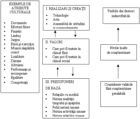 Definitia lui Schein data culturii organizationale evidentiaza ideea ca in cultura sunt cuprinse presupuneri, adaptari, perceptii si invatare. El continua spunand ca organizatii ca Walt Disney sau Compaq Computer de exemplu, au trei niveluri culturale, prezentate in figura 1.