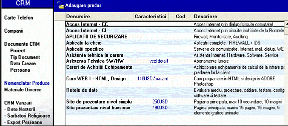 Pentru a-l ajuta in relatia cu un client operatorul are acces la lista cu produsele si serviciile oferite, caracteristici, descriere si preturi (Figura 4).
