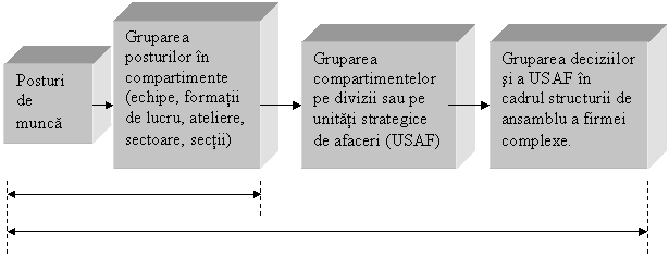 Fata de etapele de mai sus este necesar a se face precizarea ca gruparea posturilor in compartimente si integrarea acestora intr-o structura se realizeaza numai in momentul in care firma a atins o anumita dimensiune.