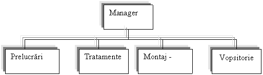 Compartimentarea tehnologica grupeaza posturile de munca dupa fazele sau operatiile tehnologice necesare realizarii unui produs, serviciu sau lucrare. Daca de exemplu realizarea unui produs presupune strunjirea ,materialelor urmata de tratarea termica a pieselor, asamblarea acestora si vopsirea produsului atunci compartimentarea tehnologica se concretizeaza intr-o structura de forma celei din figura 1.9.