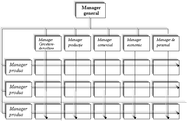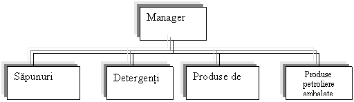 Compartimentarea pe produse presupune gruparea la un loc a tuturor posturilor care participa la realizarea unui produs sau a unei grupe de produse asemanatoare. Aceasta compartimentare faciliteaza specializarea inalta a personalului si formeaza competitia dintre produse. Compartimentarea pe produse conduce la o structura de forma celei din figura 1.10.