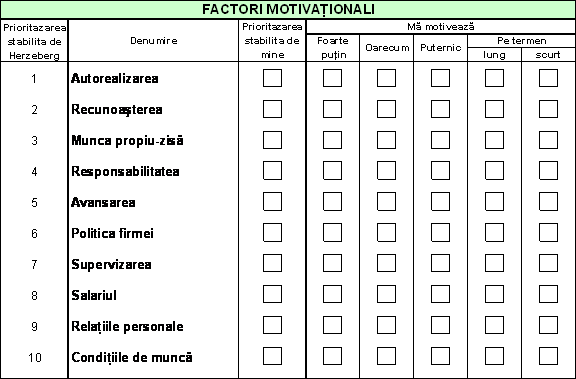 Ganditi-va la factorii pe care i-a evidentiat Herzberg si determinati cat de bine corespunde teoria lui experientei voastre personale. Notati-va raspunsurile in lista de mai jos.