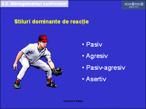 In cateva cuvinte, un individ reactioneaza in mod pasiv cand nu vorbeste in numele sau, nu-si exprima nevoile, asteptarile, dorintele si se victimizeaza. Stilul agresiv este caracterizat printr-un comportament abuziv si sarcastic, prin blamarea celorlalti. Persoanele pasiv-agresive nu raspund direct, ci se adreseaza martorilor, nu ocupa imediat o pozitie de confruntare, ci isi promit ca o sa se razbune. O comunicare asertiva inseamna exprimarea onesta, deschisa a sentimentelor si satisfacerea nevoilor proprii acelui individ fara afectarea celorlalti.