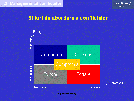 Analiza optiunilor. Cadrul de abordare a conflictului este unul de tip "castig-castig", deci solutiile propuse trebuie analizate din perspectivele ambelor parti, astfel incat sa atinga obiectivele si sa mentina o relatie armonioasa.