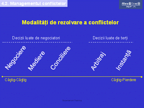 Trecerea la actiune. Realizarea actiunii convenite este importanta pentru crearea unei relatii de incredere, ce va face ca discutiile viitoare sa fie mai deschise, ducand, pas cu pas, la rezolvarea conflictului.
