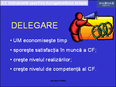UM incredinteaza unei alte persoane autoritatea si responsabilitatea realizarii unei sarcini clar definite si acceptate, sub supravegherea sa si cu mentinerea intregii raspunderi pentru succesul actiunii.