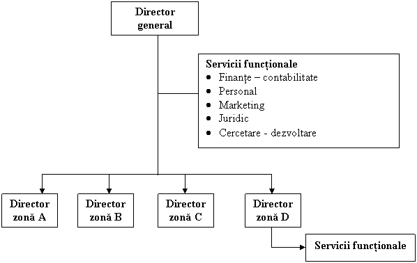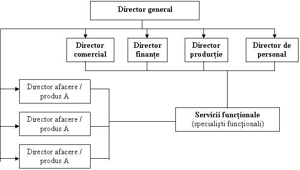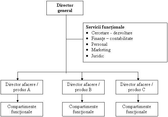 Structura pe unitati descentralizate de profil (divizii) - presupune gruparea activitatilor pe afaceri si linii de productie (ex. General Motors - Oldsmobile, Buick, Pontiac, Cadillac, Chevrolet).