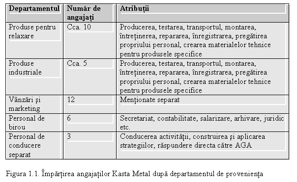 Dupa cum spuneam in cadrul firmei exista inca un alt departament organizat, acela de vanzari si marketing, precum si alte cateva activitati separate preluate de personalul de birou. In total Kasta Metal are angajati in Bucuresti circa 35 de angajati, impartiti dupa cum se poate vedea in tabelul atasat.