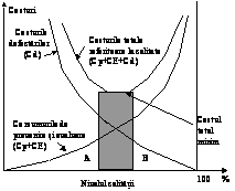 Asa cum rezulta din figura, exista un punct pe curba costurilor totale in care aceste costuri sunt minime, iar nivelul calitatii corespunzatoare zonei hasurate (cuprinsa intre punctele A si B pe abscisa) este considerat optim. In zona respectiva, numita si "zona neutra", costurile defectelor (Cd) sunt aproximativ egale cu costurile de prevenire si evaluare (Cp+Ce).