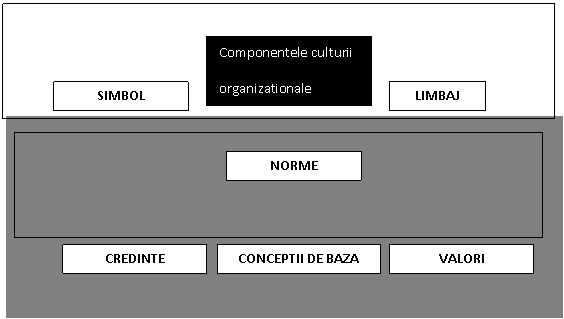 - nivelul secund, alcatuit din valorile si normele partajate de membrii organizatiei. El se reflecta partial in simbolurile si limbajul utilizat in organizatie;