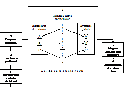 Primele incercari de intelegere a procesului deciziei au la baza doua presupuneri: (1) oamenii sunt rationali din punct de vedere economic si (2) oamenii incearca sa‑si maximizeze rezultatele intr‑un proces ordonat si secvential. Rationalitatea economica este, asadar, maximizarea avantajelor masurate, spre exemplu, banii sau bunurile produse. Oamenii vor selecta, din mai multe alternative, cursul de actiune cel mai avantajos sau cel mai bine platit. Ei fac aceasta alegere printr‑un proces planificat, ordonat si logic. Acest proces, ilustrat in figura 1 cuprinde: