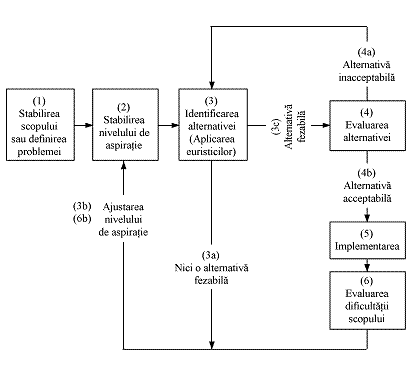 (3) Folosirea euristicilor care restrang spatiul problemei la o singura alternativa promitatoare. Daca nici o alternativa fezabila nu este identificata (3a) se coboara nivelul de aspiratie (3b) si se incepe cautarea unei noi alternative (repetand pasii 2 si 3).