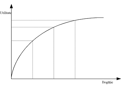 Satisfactia nu creste proportional cu cresterea bogatiei. Justificarea psihologica a fenomenului rezida in faptul ca fiecare crestere succesiva in bogatie este folosita pentru satisfacerea unor trebuinte mai putin impor-tante. Deoarece banii au o valoare numai in masura in care satisfac trebuintele, ei devin mai putin importanti dupa ce trebuintele cele mai importante au fost satifacute. Functia utilitatii prezentata in figura 4 arata cum castigurile mici sunt, proportional, mai valoroase pentru individ decat castigurile mari. Previziunea teoriei utilitatii cardinale este ca, in luarea deciziilor in conditii de risc, oamenii prefera castigurile mici, sigure, castigurilor mari, riscante. Diferenta dintre castigul mai mic si castigul mai mare, fiind destinata unor trebuinte mai putin importante, nu justifica riscul. Analiza 'utilitatii marginale' a constituit o problema importanta a studiilor economice din sec. XIX.