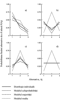 Nivelarea neuniformitatilor preferintelor individuale are loc, in schimb, daca asupra preferintelor individuale opereaza shema echiprobabi-litatii. Atat bimodalitatea (b) cat si simetria (c) sunt reduse in preferintele grupului in raport cu distributia individuala.